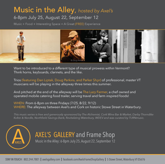 Join myself, former teacher Bruce Sklar (Piano), Kevin Avery (Trumpet), Brent Thomas (Bass), and Andy Gagnon (set) in the Alley between Axel’s Gallery and Cork for a night of music, food and drink. We are the first show to kick off this summers series. Free show, we hit at 6 PM! More info HERE.